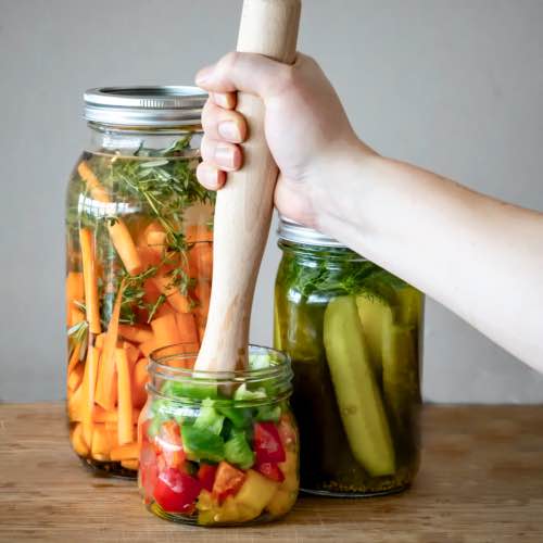 Met deze houten stamper kun je de groente in een pot goed aandrukken om te fermenteren. Door de groente te stampen en zout toe te voegen, breken de celwanden en komt er vocht vrij. Dit vocht vormt een pekel waarin de groente wordt ondergedompeld, hierna start het fermentatieproces.